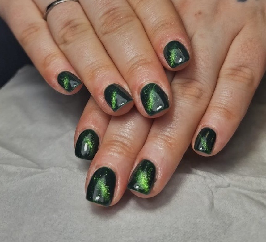 Captivate everyone with these mesmerizing cat eye nails in deep emerald green! The rich, jewel-toned green has incredible depth, with bright emerald highlights dancing across a mysterious black base. What makes this design particularly special is its practicality—the shorter length means you can celebrate St. Patrick’s Day without sacrificing functionality. Perfect for those who want an enchanting yet easy-to-wear look, this magnetic manicure captures the mystical spirit of Irish legends in a modern, wearable way.