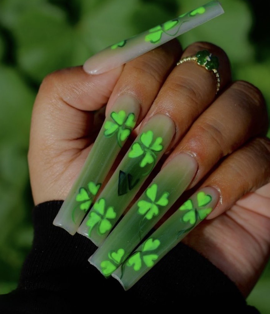 You don’t need a pot of gold when your nails look this rich. These long, translucent coffin-shaped nails are decked out with vibrant neon green shamrocks that practically glow against a dreamy gradient base. The sheer jelly background gives just enough softness to make the clovers pop, while the ultra-smooth shape screams “main character energy.”
